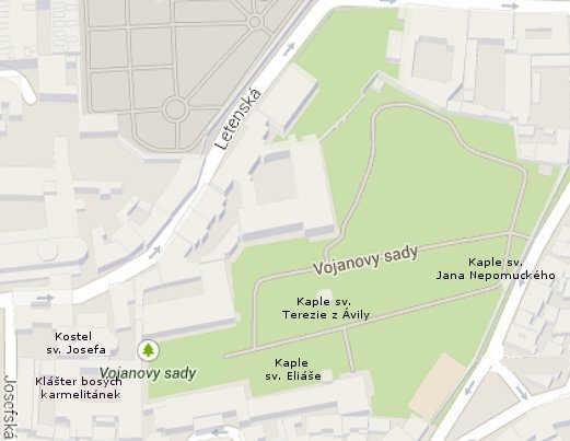 Bei dem Kloster, versteckt hinter Mauern und Häusern, breitet sich der älteste Garten Prags (1248 erstmals erwähnt) Richtung Moldau aus, der Vojan Garten (Vojanovy Sady), benannt nach Eduard Vojan, einem Schauspieler. Die einzigartige Atmosphäre lässt den Besucher in beschaulicher Ruhe unter einer schattigen Bank nachdenken über Vergangenheit und Gegenwart ...